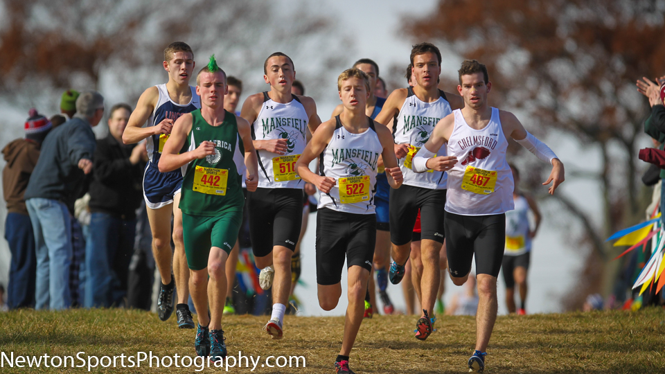 The Div. 2 race proved to be the most wide-open race of the day on the boys' side as a half dozen runners passed the mile in 5:00 and were still jockeying for position at the halfway mark. Lincoln-Sudbury's Joshua Kerber made the decisive move over the final 800 meters and pulled away for the win in 15:33.6. Billerica's P.J. Garmon was a strong second in 15:38.1 and Dan Romano of Mansfield took third in15:45.8. Romano led Mansfield to the team title with 61 points. Julie Collins' crew placed its top five harriers in the top 20 to easily defeat Lincoln-Sudbury's 106 points. Chelmsford was third with 123 points.