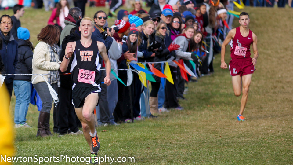 There were no surprises in the lead pack of the Div. 1 race with the Newton North duo of Gabe Montague and Mike Schlicting up front with Lowell's Johnny Abraham. The race became a three-runner affair shortly after the halfway point and it was Schlicting who struck first with a half mile to go. The Tiger surged into the lead and held off the hard-finishing Abraham for the 15:29.9 win. Abraham was three seconds back in 15:32.4 and Montague finished strong in 15:40.8.